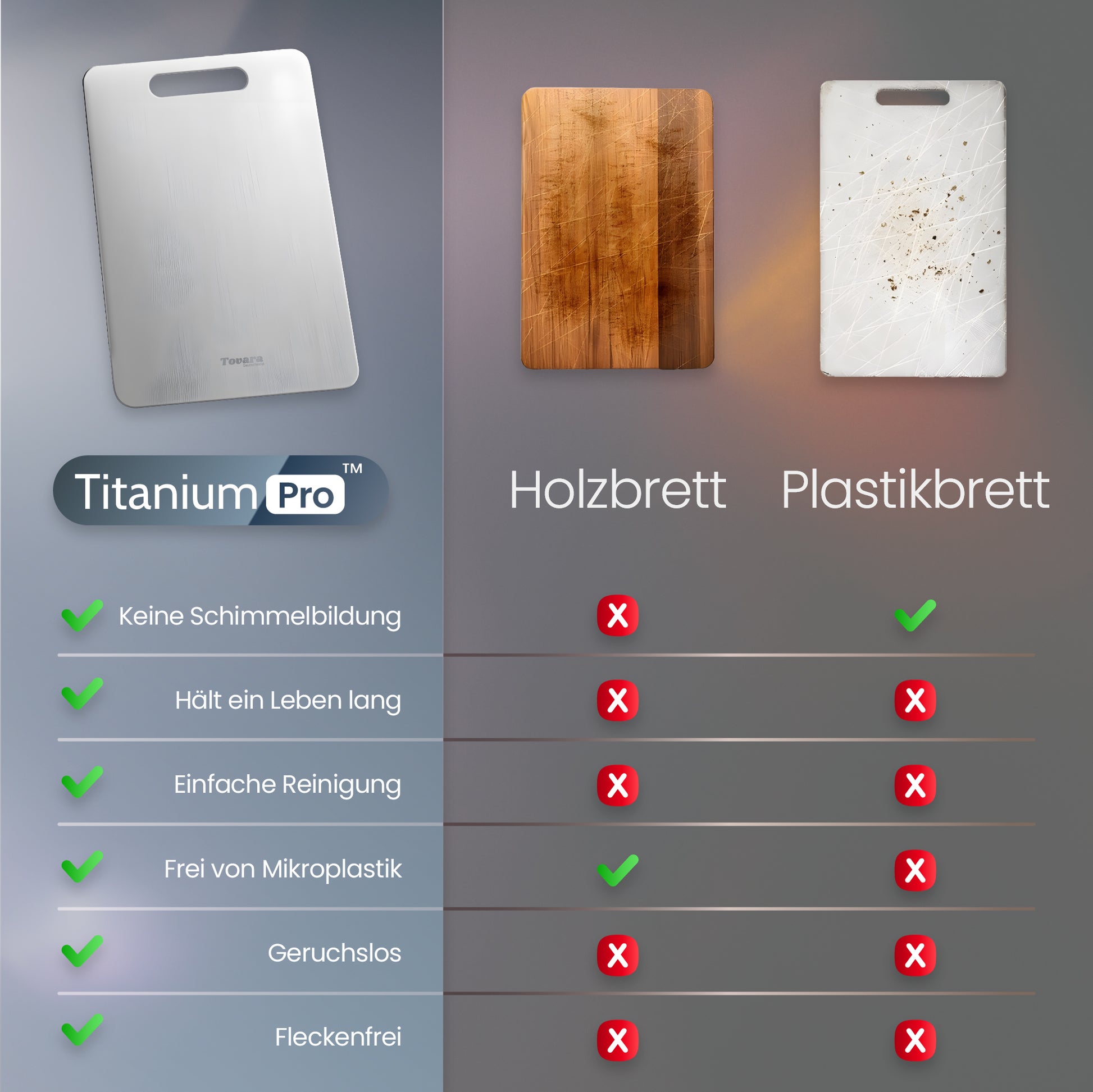 Echtes Titan hat seinen Preis – und das aus gutem Grund. Es bietet überlegene Hygiene, extreme Langlebigkeit und ist das ideale Material für Schneidebretter.