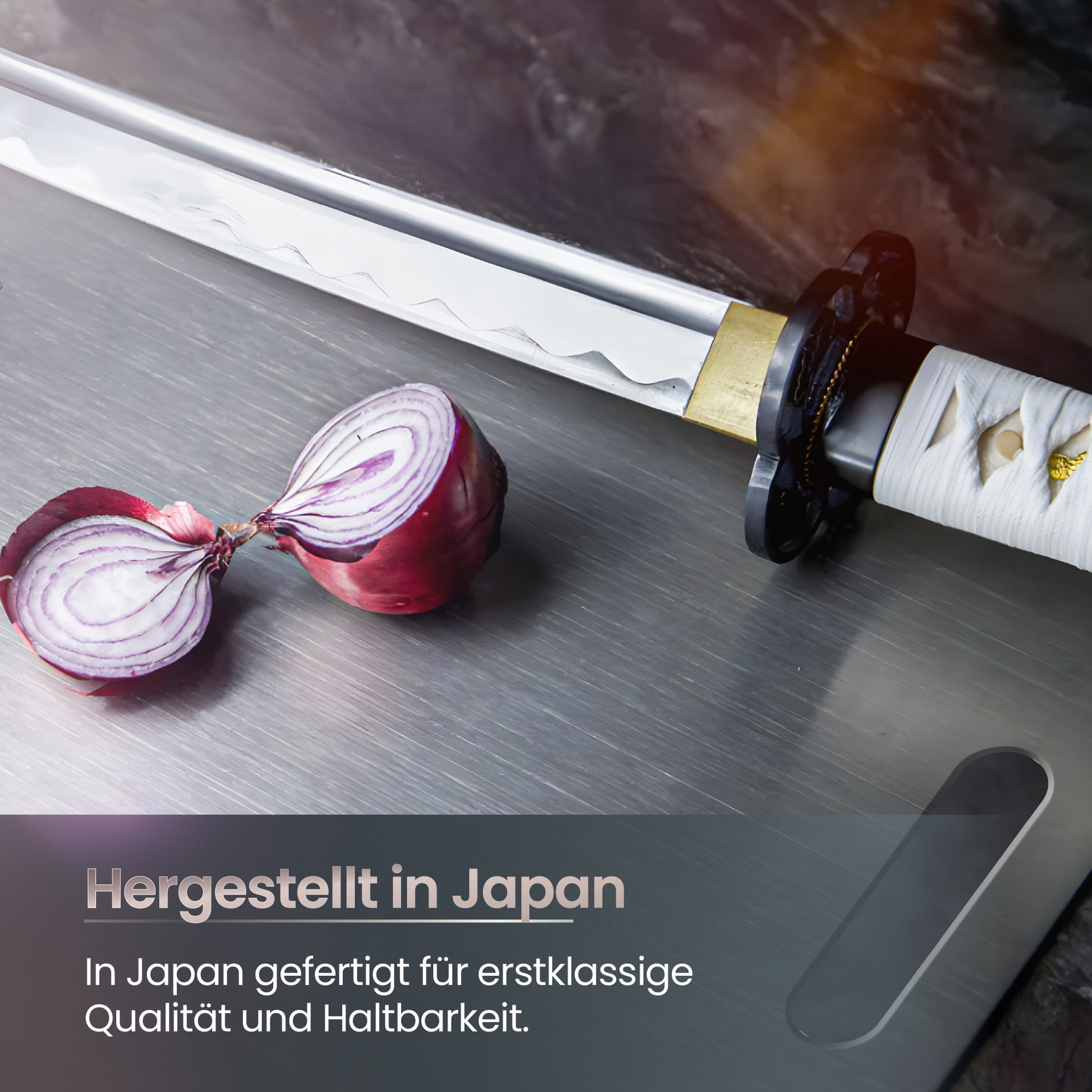 Reines Titanium ist ein hochwertiges Material, das extrem langlebig und hygienisch ist. Es ist korrosionsbeständig, nicht reaktiv mit Lebensmitteln und schont Messer. Daher ist es eine langfristige Investition in Qualität und Sicherheit.