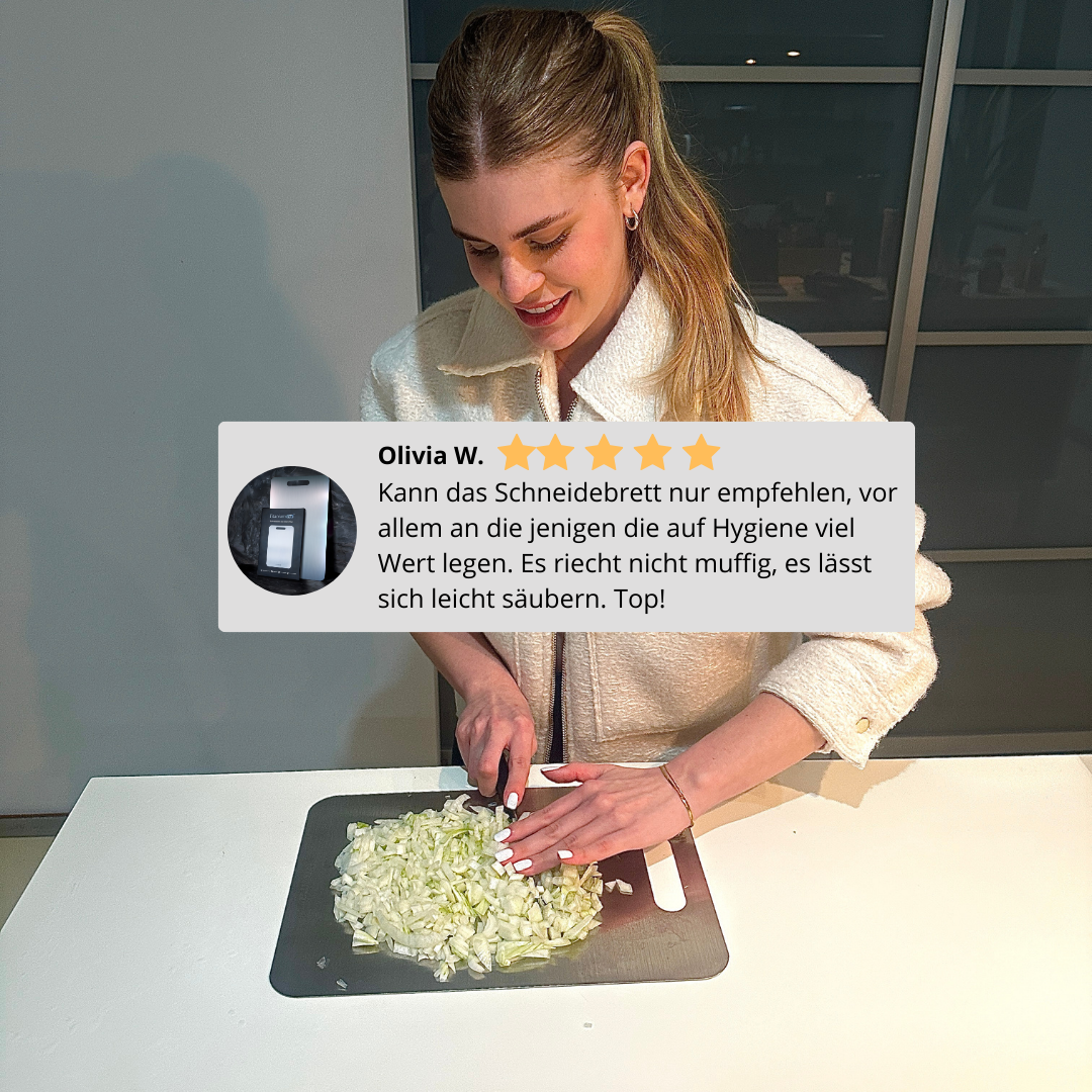 Das TitaniumPro™ Schneidebrett ist zudem super leicht zu reinigen – einfach abspülen oder in die Spülmaschine geben. Eine Investition, die sich langfristig auszahlt – für eine gesunde, sichere und nachhaltige Küche.