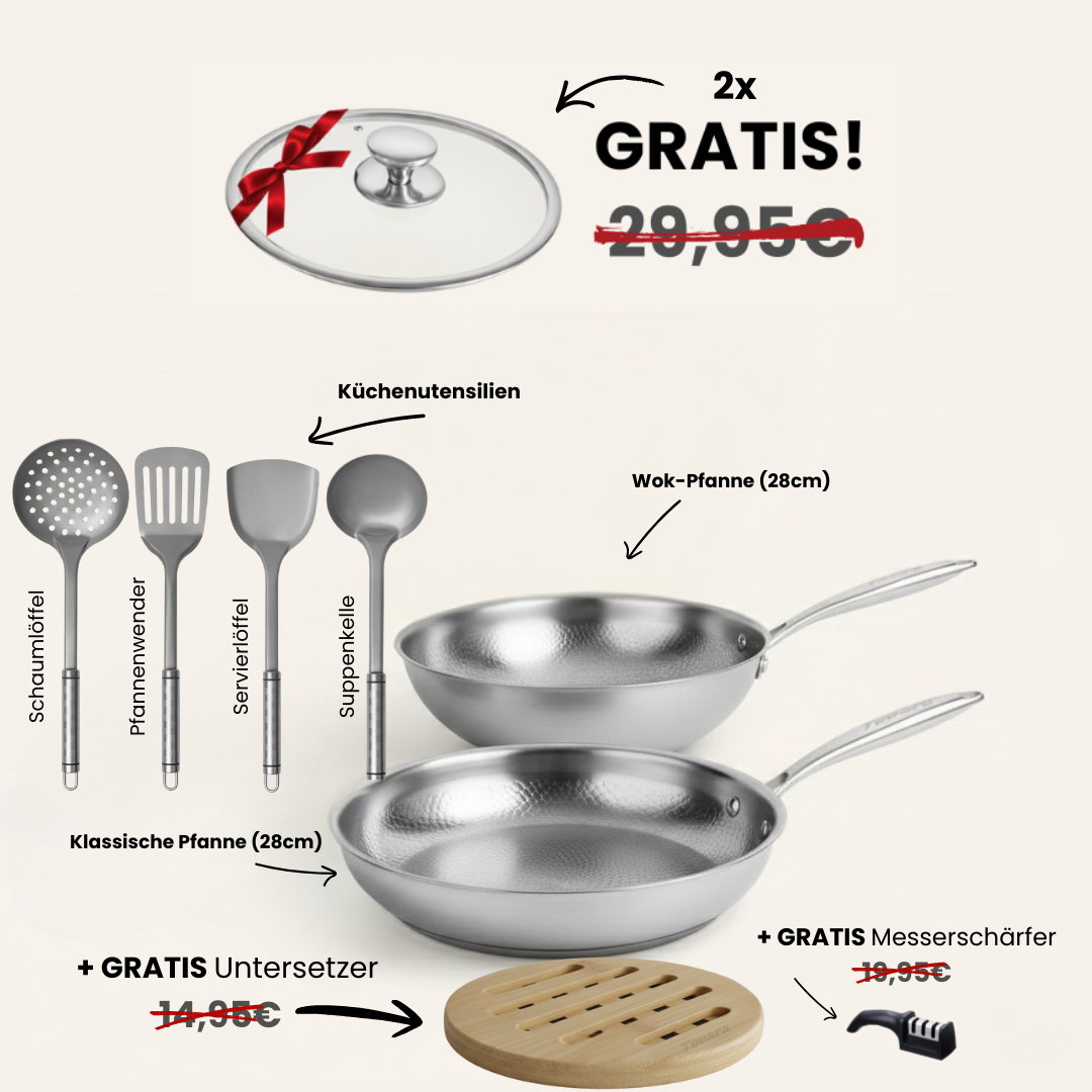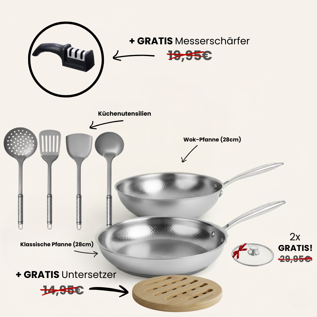 Das TitaniumPro™ Pfannen Basic-Set enthält unsere klassische TitaniumPro™ Pfanne (28cm) inkl. GRATIS Deckel, unsere beliebte Wok-Pfanne (28cm) inkl. GRATIS Deckel, unsere Küchenutensilien aus Titan, einen kostenlosen Messerschärfer, einen GRATIS Untersetzer sowie GRATIS Pfannenwender