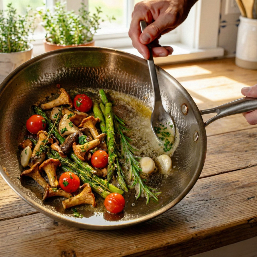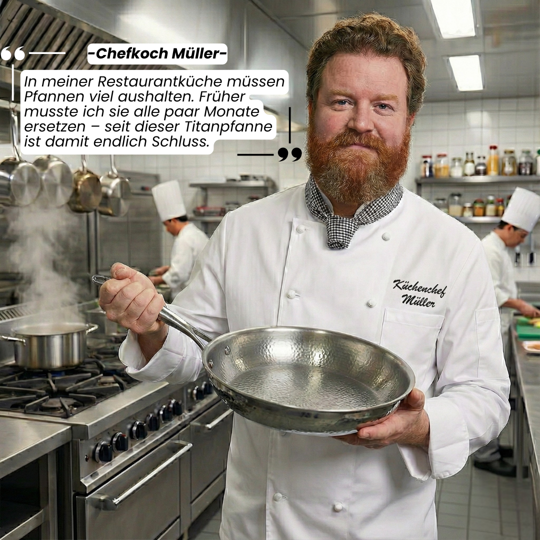 Nein, Titan ist völlig geschmacksneutral und reagiert nicht mit Lebensmitteln. Im Gegenteil – durch die gleichmäßige Wärmeverteilung bleiben mehr Nährstoffe und Aromen im Essen erhalten.
