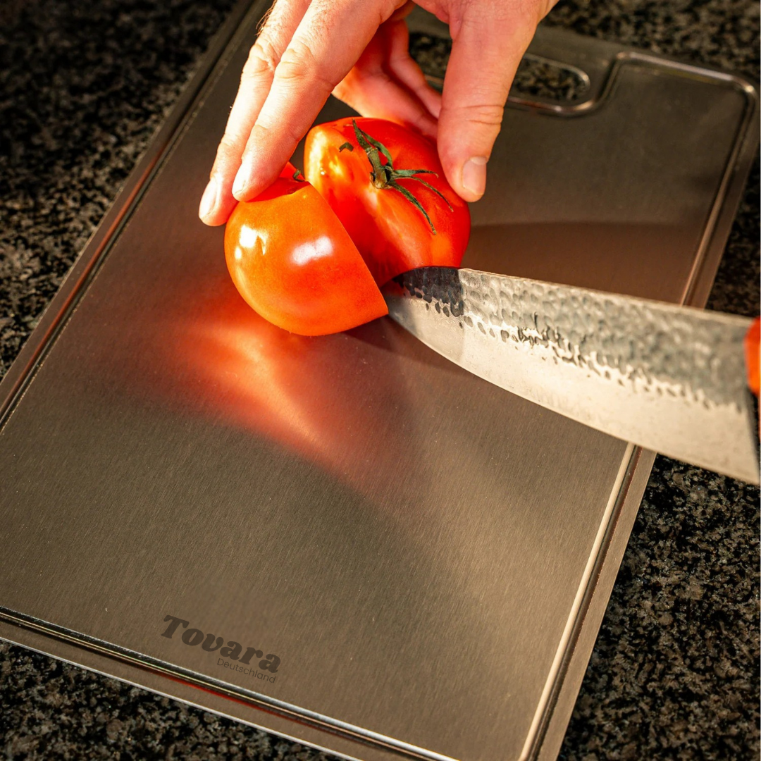 Reines Titanium ist ein hochwertiges Material, das extrem langlebig und hygienisch ist. Es ist korrosionsbeständig, nicht reaktiv mit Lebensmitteln und schont Messer. Daher ist es eine langfristige Investition in Qualität und Sicherheit.
