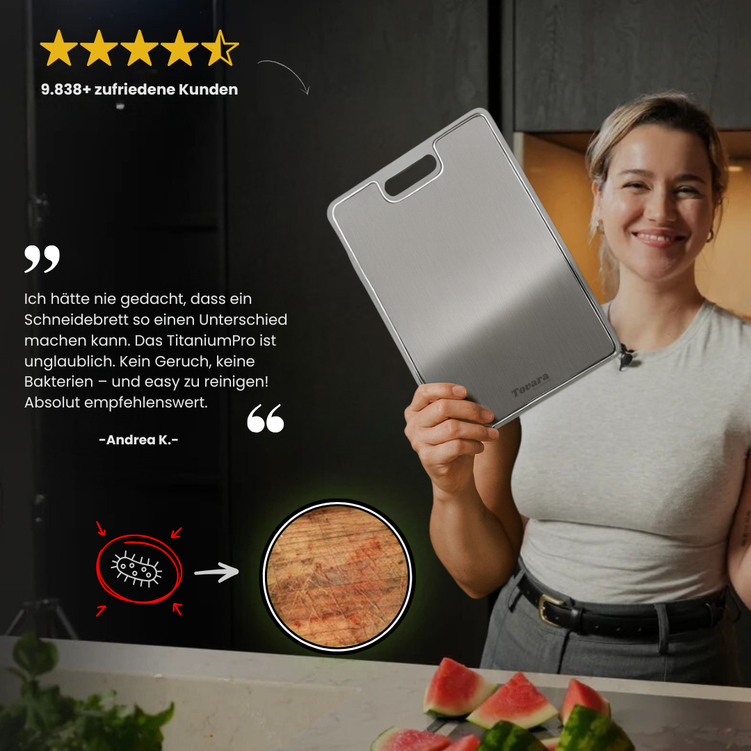 Das TitaniumPro™ Schneidebrett ist zudem super leicht zu reinigen – einfach abspülen oder in die Spülmaschine geben. Eine Investition, die sich langfristig auszahlt – für eine gesunde, sichere und nachhaltige Küche.